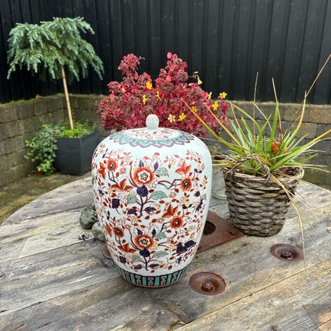 BOJAN, Made in China, Kinesisk bojan fra 80èrne i beige bundfarve og med søde blomstermotiver. - Under bunden: Made in China - - 28 cm høj - har reparation i lågkant - se foto, ved ikke om den er fra fremstilling eller lavet senere,