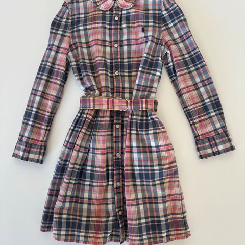 Ralph Lauren kjole til piger i størrelse str. 7 år/small. Kjolen er midnatsblå, højhalset med stofbetrukne knapper og korte ærmer med små læg samt et bælte i taljen i blå og grønne skotsktern. Klassisk RL model.