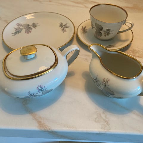 Royal Copenhagen kaffestel med blomsterdekor. Sættet indeholder kopper, underkopper, kander, sukker- og flødekander samt forskellige fade. Designet med grønne og røde blomster samt grønne striber. Fremstillet i porcelæn.