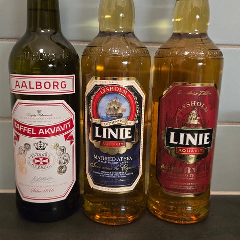 Æske med 10 stk små flasker af forskellige Aalborg Akvavitter.