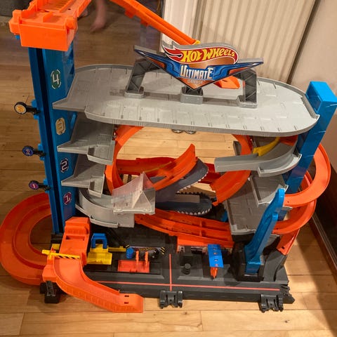 Super fed Hot Wheels Ultimate Garage legetøjs bilbane med flere niveauer. Indeholder ramper, katapult afgang for bilerne, hvor de skal ramme dragens mund og den automatisk vil "rulle" ned på "gade" plan samt parkeringspladser til Hot Wheels biler.