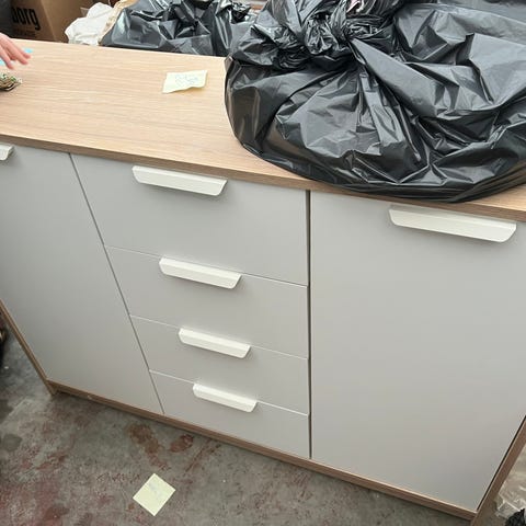 Fin skænk/kommode. Med hylder bag låge, og skuffer i midten
