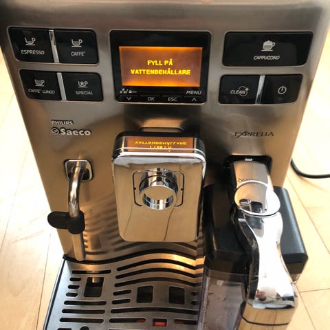 Saeco / Phillips espressomaskine. Til hele bønner eller malet kaffe. Integreret mælkeskummer