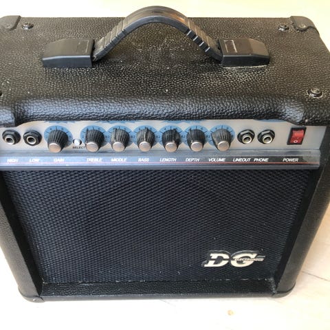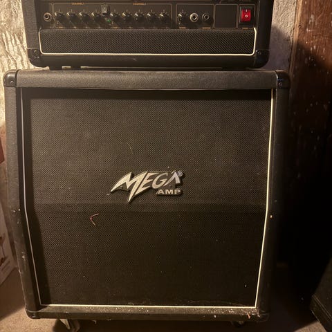 Mega SL-20 guitarforstærker med en effekt på 20W. Forstærkeren er designet til brug med elektrisk guitar og har flere kontrolknapper til justering af lydniveau og tone.