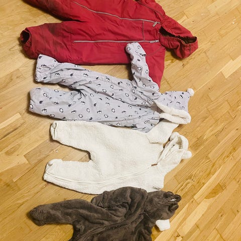Lyserød jakke med hætte i mærket BombiBitt, elefanthue fra Joha og lilla strikvanter sælges samlet efter først til mølle princippet.