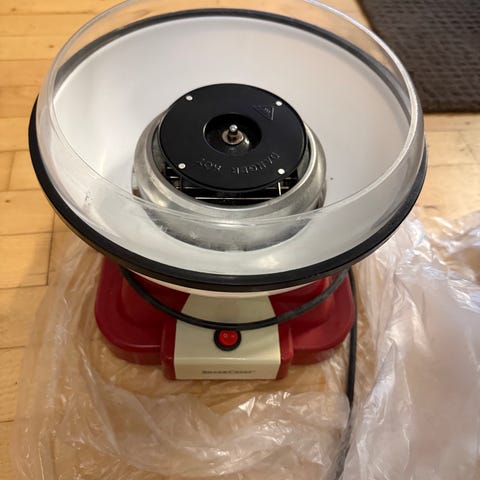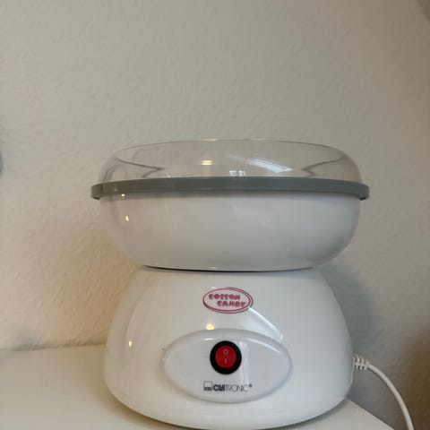 Nostalgia Electrics Retro Candy Cotton Candy Maskine i rød farve. Maskinen er designet til at lave sukkerspind og har en gennemsigtig skål og låg for nem overvågning under brug. Den har en kompakt størrelse, der egner sig til hjemmebrug.