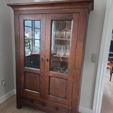 Mega flot massiv egetræ vitrineskab med glaslåger. Vi har proppet film på glaslågerne indvendig, så man ikke kan se tingene, men det kan tages af let. Det er muligt at flytte en smule på de 2 øverste hylder og den nederste. Den anden nederste er skruet fast for at holde skabet stabilt.