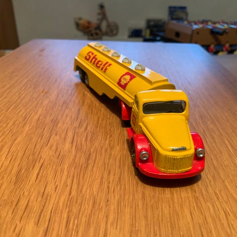 Esso Tankvogn legetøj lastbil i rød farve med trailer, fremstillet i metal. Modellen forestiller en tankvogn med seks hjul på trailer og fire hjul på førerhus. Velegnet til samling eller som legetøj.