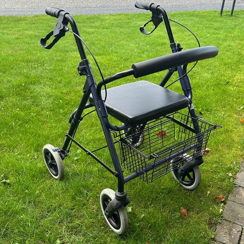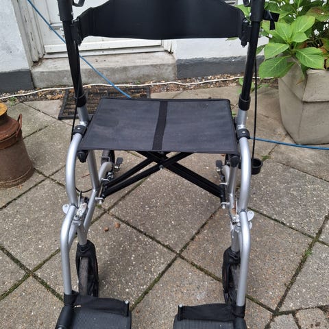 Rollator med sæde, håndtag og hjul til støtte ved gang. Designet til at give balance og komfort under bevægelse. Velegnet til personer med behov for ganghjælp.
