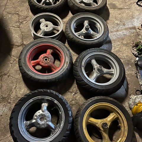Scooter hjul fra en Suzuki katana. Det er et forhjul med dækstørrelsen 120/70-12. Skriv hvis det har interesse.