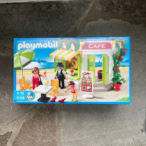 Playmobil cafe / fast food restaurant med fuldt interiør og madvarer. Playmobil sæt 6220 og 6441.