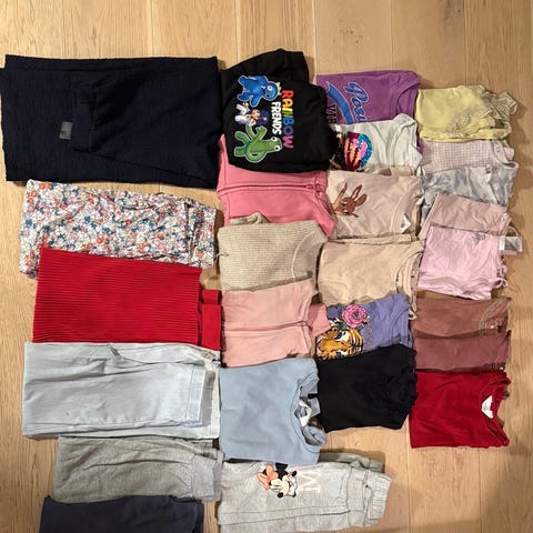 Kæmpe pigetøjspakke i str. 98. Tøjet har bl.a. motiv af Hello Kitty og Anna og Elsa fra Frost. Pakken består af 14 bluser, 4 kjoler, 2 nederdele, 1 top, 6 par bukser, 1 par shorts, 2 undertrøjer, 2 par underbukser og 2 bodyer. Det sælges samlet efter først til mølle princippet.