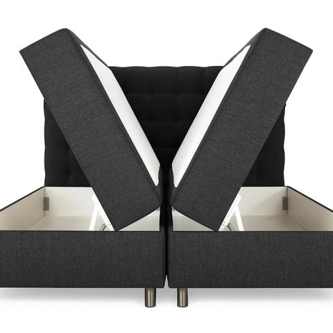 Seng med opbevaring har en sort træramme og måler 210 cm i længden. Sengen har lamelbund og en madras med betræk. Opbevaringsrummet under sengen kan tilgås ved at løfte lamelbunden, som er understøttet af metalbeslag. Madrassen er gratis til sengen.