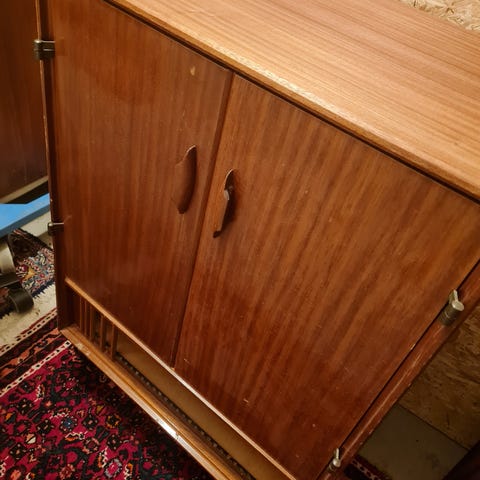 Gammelt TV skab i teak. Messing hængsler. Lille afslag på nederste hjørne. Overfladerust på hjul og hylde. Evt. Projekt til syskab, barskab.