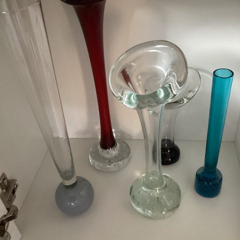 Holmegaard orkidevaser bestående af 4 stk. i forskellige størrelser og farver. Vaserne er lavet af klart og farvet glas med dekorative ornamenter i bunden. Velegnet til dekoration og blomsterarrangementer. 16-24 cm høje. Grøn og rød vase koster 250kr og de andre koster 200kr. Prisen er pr. Stk.