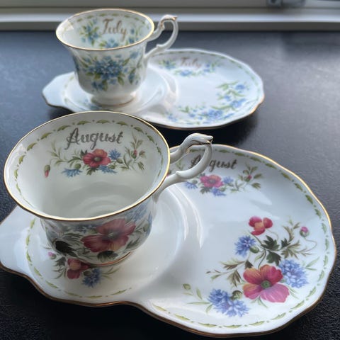 Royal Albert månedes kop + underkop + sidetallerken. Marst . Kop måler 7cm høj og sidetallerken 20,5 cm i diameter. Hel og fin stand. Pris 245kr. ( 3 Dele)
