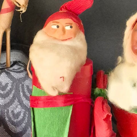 Noget afdanket slikbeholder fra omkring 1940'erne noget slidt og brugt. Hovedet i en form for blandings materiale, skæg i vat, piberenser arme samt hue og sæk i crepe papir. Skægget noget gullig og der er kommet hul i sækken.