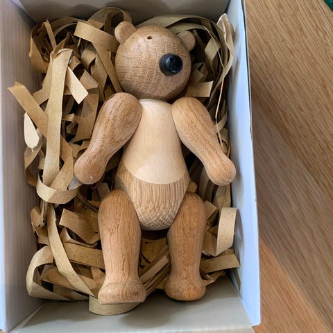 Helt ny. Modtaget i gave fra arbejdet. Kay Bojesens elskede bjørn er en tidløs klassiker, der bringer glæde til både børn og voksne. Bjørnen er omhyggeligt fremstillet i eg og ahorn, der giver den et naturligt og varmt udseende. De bevægelige arme og ben giver mulighed for leg og fantasifuld historiefortælling. Lad Kay Bojesens ikoniske bjørn sprede glæde på børneværelset, i stuen eller på kontoret. Ny pris kr. 799