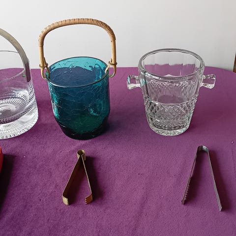 Ispande retro glas. Grønt og klart glas. Incl tang til at tage isen med. Sælges til 125,- stk incl istang, eller 200,- for alle 4 dele.