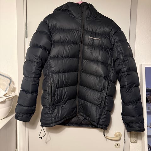 Peak Performance Vinterjakke i sort farve, størrelse L til mænd. Fremstillet i bomuldsmateriale. Jakken er designet til udendørs brug i vinterforhold.