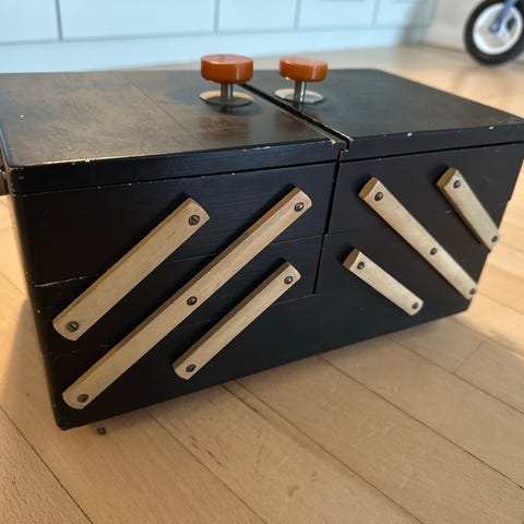 Syæske med metalbeslag og håndtag, brun farve. Syæsken har et hængslet låg og er velegnet til opbevaring af små genstande.