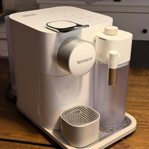 Nespresso Gran Lattissima espressomaskine med integreret mælkeskummer. Maskinen har et kompakt design og flere funktionelle knapper til forskellige kaffetyper. Farven er hvid med sølvdetaljer. Fejler intet. Afhentes i Hundige