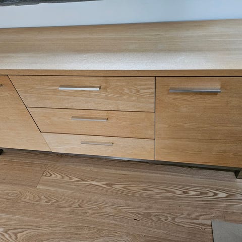 Skænk i egetræsfiner med en hvid topplade. Indeholder to skuffer i midten og skabe på hver side med træhåndtag. Designet med skråtstillede ben i træ. Der er et lille mærke i den højre låge, kan ses på et af billederne