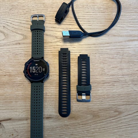 Garmin Forerunner 305 pulsur med GPS-funktion. Enheden har en sort og rød farve og er designet til at blive båret om håndleddet. Den inkluderer en oplader til genopladning af enheden. Rigtig fin stand og ingen ridser.