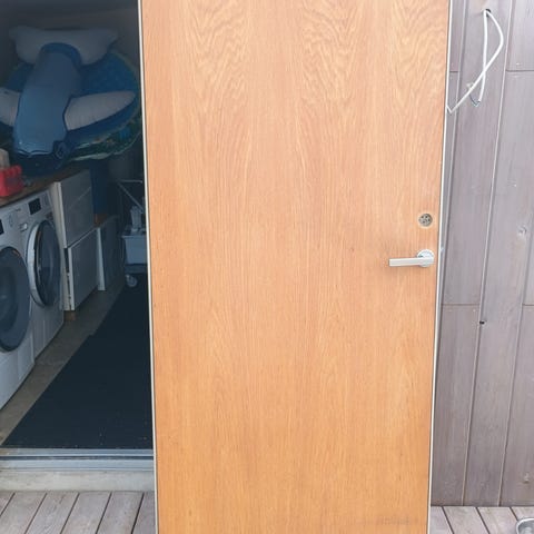 Smuk hoveddør i egetræ fra danske Krone vinduer/ døre. Dørblad i fineret eg. 950 x2000 mm. Uden karm. Med Ruko trepunkts lås. 1,5 år gammel. Udskiftet i forbindelse med renovering af hus.