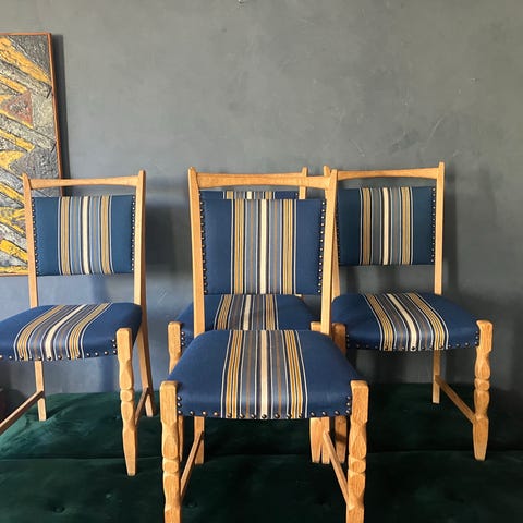 Henning Kjærnulf for Møbelfrakken Lindebjerg. 6 stk. spisestole i det smukkeste velbevarede egetræ fra 60’erne. De er i helt fantastisk stand alderen taget i betragtning (kun få brugsspor). De er mærket i bunden. Se foto.
