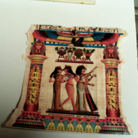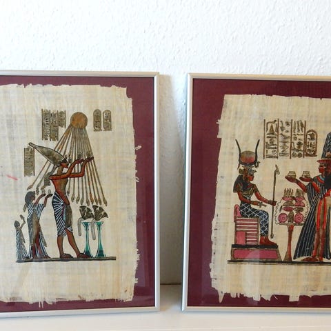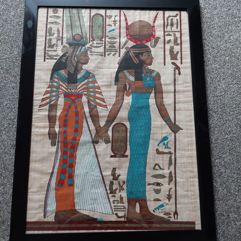 ÆGYPTISK PAPYRUS, Stor papyrus dim 35 x 75 cm, Kopi af ægte papyrus med motiv af faraoer, præster og guder, Materiale ægte papyrus og med flotte farver, særligt den koboltblå,