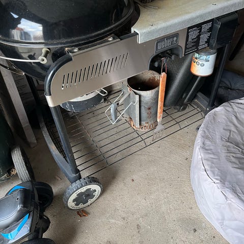 Weber kuglegrill i sort farve med låg og stativ. Grillen har en rund form og er velegnet til udendørs madlavning. Den er designet til kulgrillning og har en ventilationsåbning på låget for temperaturkontrol.