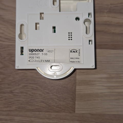 Uponor T-55 termostat i hvid farve med IP20 klassificering og T45 modelnummer. Drives af 2 x 1,5V AAA batterier. Designet til regulering af rumtemperatur. 4 stk. sælges samlet