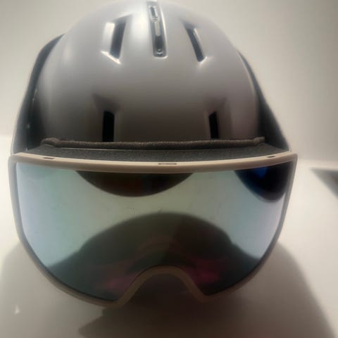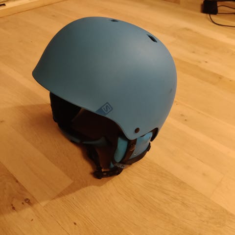 Stålgrå/Lyseblå skihjelm fra Salomon med mulighed for at spænde skibriller fast. Meget blødt for. Str. XS som svarer til en hovedomkreds på 54-55 cm.