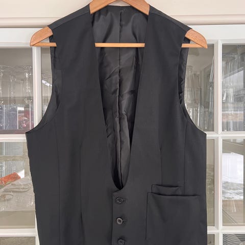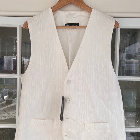 Elegant cremefarvet vest fra Masterhand. Klassisk dressvest med dyb V-udskæring, stofbetrukne knapper og paspolerede lommer foran. Justerbar spænde i ryggen for bedre pasform.