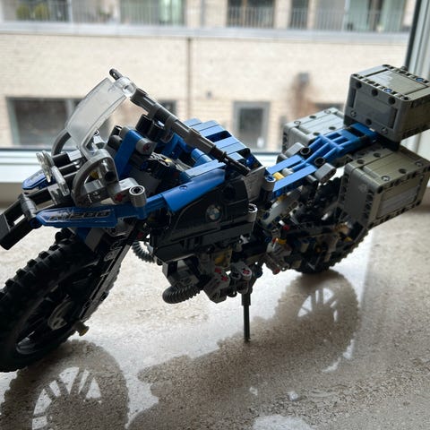 LEGO Technic motorcykel i rød farve. Modellen er detaljeret med funktionelle dele, der efterligner en ægte motorcykel. Fremstillet i plastikmateriale med bevægelige hjul og styr. Velegnet til samling og udstilling.