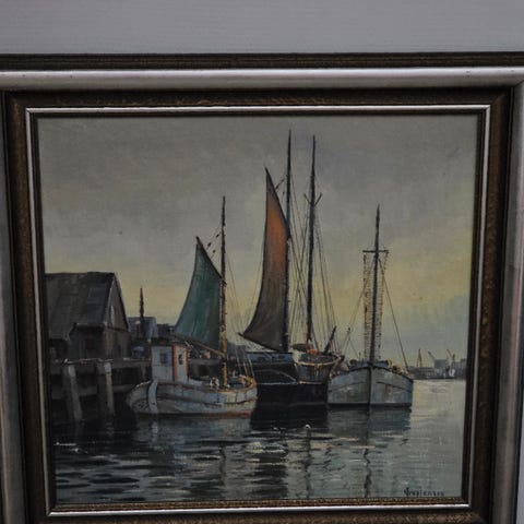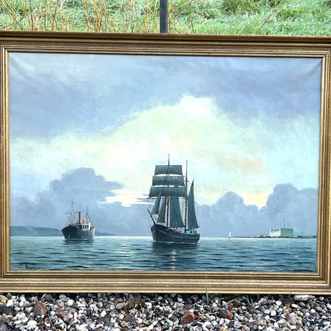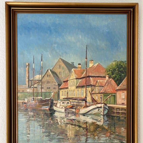 Stort Arup Jensen maleri med maritimt Køge motiv