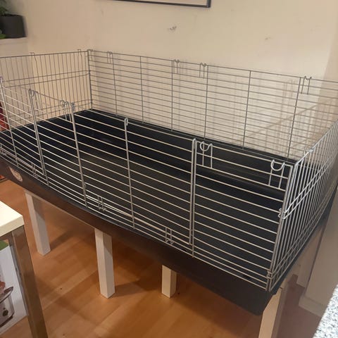 Kæledyrsbure med metalgitter og plastikbund. Buret har en blå bund og metalgitter i sølvfarve. Velegnet til små kæledyr som kaniner eller marsvin.