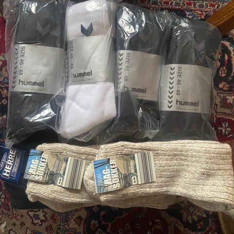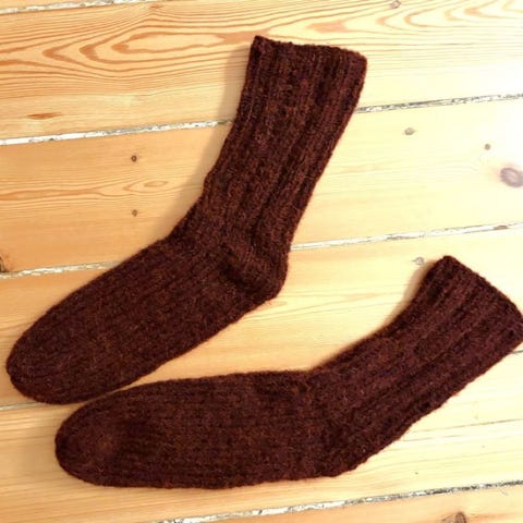 Hjemmestrikkede ragsokker i 75% superwash uld og 25 % polyamid, der tåler maskinvask, bemærk højde fra gulv 39 cm. kan sendes med Dao kr 45