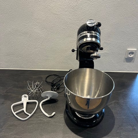 Model 5KSM150 i sort. Fin maskine, der virker som den skal. Der medfølger dejkrog, k-spade og piskeris. Dertil kødhakker, der er stort set ubrugt og en KitchenAid Ismaskine, som også kun er brugt ganske få gange.