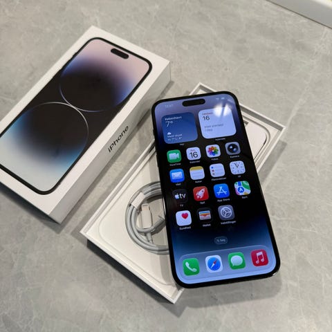 Apple iPhone 14 Pro Max mobiltelefon med 256 GB lagerplads. Enheden har en sort farve og leveres med original emballage og tilbehør, herunder opladerkabel.med panzerglass, Kvittering haves , batteri kapacitet 82% (perf. stand sælges kun fordi jeg fik ny som gave ) Kan ikke sende kun personlig afhentning .