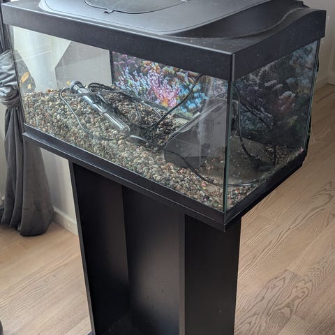 Akvarium af glas med tilbehør inklusive filter, belysning, dekorationer og skaller. Passer til opdræt og opbevaring af ferskvands- eller saltvandsfisk. Indeholder forskellige nødvendige komponenter til vedligeholdelse af akvariet.