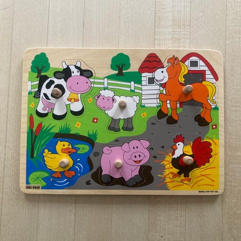 Fem fine træpuslespil til de mindste – perfekte til motorik og “find brikken”-leg. Alt er komplet og i pæn, brugt stand med almindelige brugsspor. Pakken indeholder: