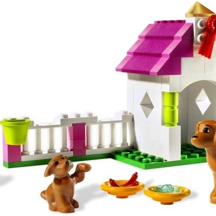 LEGO Belville legetøjshus med flere tilhørende møbler og figurer og dyr. Indeholder forskellige rum og funktioner til rolleleg. Primært i farverne pink, gul og blå, lavet af plastik. Egnet til børn.