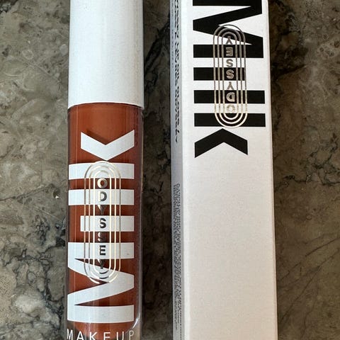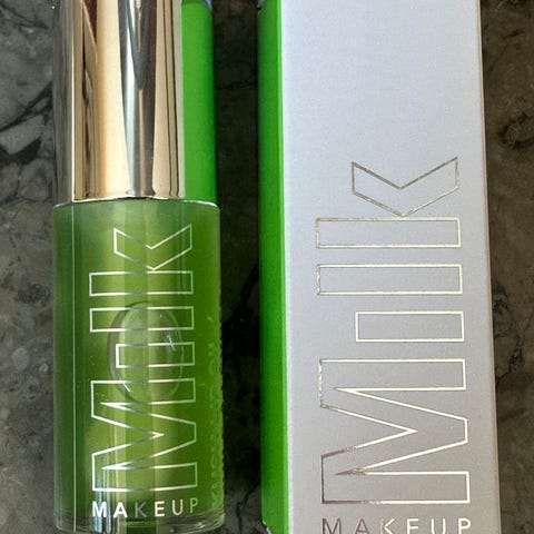 Milk Makeup Lip + Cheek. Cremet, transparent rouge og læbefarve, der giver nuancer og fugt Produktet kommer i en lille, cylindrisk emballage med grå og hvide detaljer.