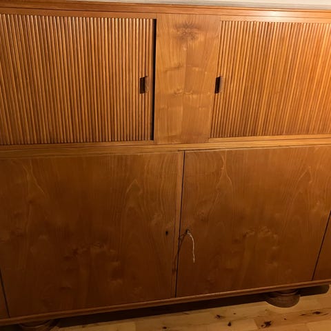 Fint Art deco skab med hylder og flotte detaljer og drejede fødder
