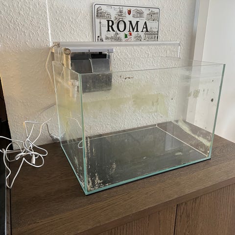 Akvarium med oase pumpe og eheim varmlægme samt lys højde 32 dybde 32 længde 45 ca 3 år gammmel superfish.