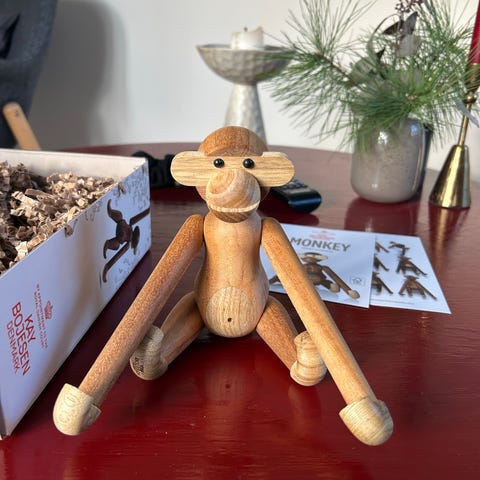 Kay Bojesen Abe træfigur i træmateriale. Figuren har bevægelige led og er designet som en abe med naturlig træfarve.