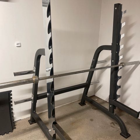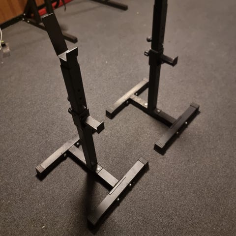 Træningsstativer til vægtløftning med justerbar højde og bredde. Fremstillet i metal med sort finish. Passer til forskellige træningsøvelser såsom squat og bænkpres.