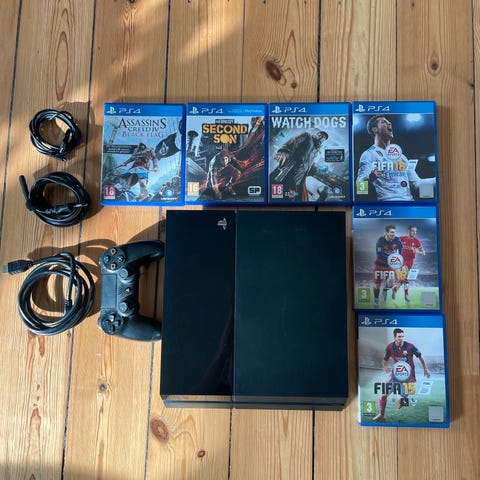 Sony PlayStation 4 købt i 2024 med to controllere i sort og hvid. Inkluderer spil: fc25 og assassins creed unity jeg tager også gerne bud